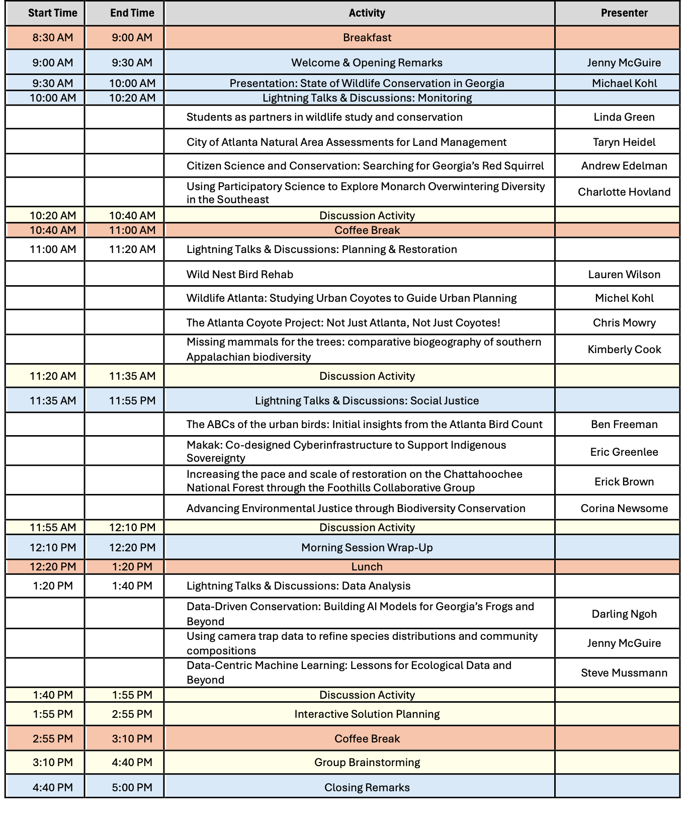 Wildlife Conservation: From Georgia’s Piedmont into the Appalachians will take place on Thursday, December 4th at the Scholars Event Theater (Price Gilbert Library, Room 1280) on the campus of the Georgia Institute of Technology. This exploratory conference is focused on bringing together academics, policy makers, and members of the nonprofit sector who are actively working on wildlife conservation efforts with the goal of identifying crucial gaps in knowledge and research where we can best place our efforts. The culmination of these discussions will be the drafting of a white paper that identifies the key strengths in wildlife monitoring and conservation as well as potential strategies for building and maintaining the community going forward. All food and beverages will be provided. Some travel stipends can be provided if needed. If you have any questions, feel free to contact us at tressa.watson@gatech.edu and jmcguire@gatech.edu.